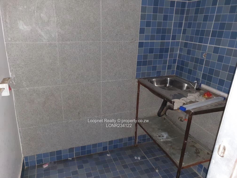 Prime retail opportunity in St. Marys, Chitungwiza — 250 m² stand with 200 m² of covered trading space. As seen in the photos, the shop offers a large, tiled open trading floor with a brick-fronted service counter and a steel security cage ideal for a bottle store, bakery counter or fast-moving retail. The front elevation features double steel doors, display window with burglar bars and a tiled forecourt for easy customer access. Behind the sales area there is a dedicated storeroom and back service area (visible sink and small prep space), plus a compact kitchen/utility tiled corner. Sanitary facilities are already installed — tiled washbasin, flush toilet and urinals shown in the images — connected to a municipal sewer system. The property is fully walled, has municipal water and good ZESA supply, providing reliable utilities for uninterrupted trading. Clean, secure and ready for fit-out or immediate occupation, this unit suits entrepreneurs seeking strong street presence at the Huruyadzo Shopping Centre. Arrange a viewing today to inspect the space and discuss conversion options.